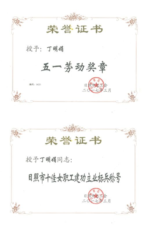 2017年3月,我公司財務總監(jiān)丁明娟被日照市總工會授予“五一勞動獎章”、“日照市十佳女職工建功立業(yè)標兵”稱號